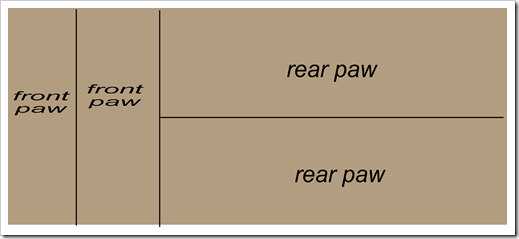 - Loaf cake – Cut large loaf as seen above to make the 2 front and 2 rear paws. Cut a slope out of each paw to create the shape (seen in picture above)